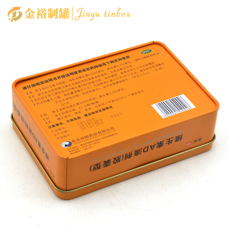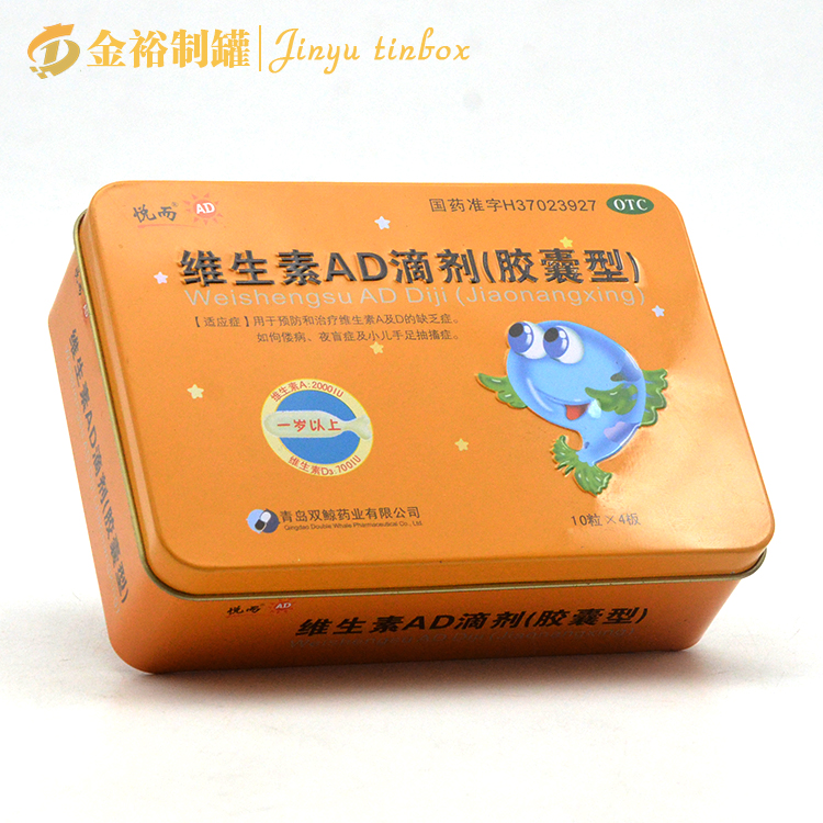 【簡介】醫藥保健品鐵盒,該鐵盒用來裝維生素AD滴劑的,用鐵盒包裝取代傳統的紙盒包裝,可以使里面的產品充滿新穎感,提高產品賣點,這樣一款鐵盒也很受孩子們的喜愛。