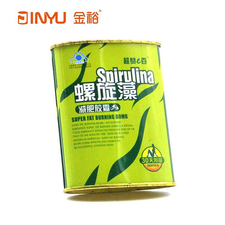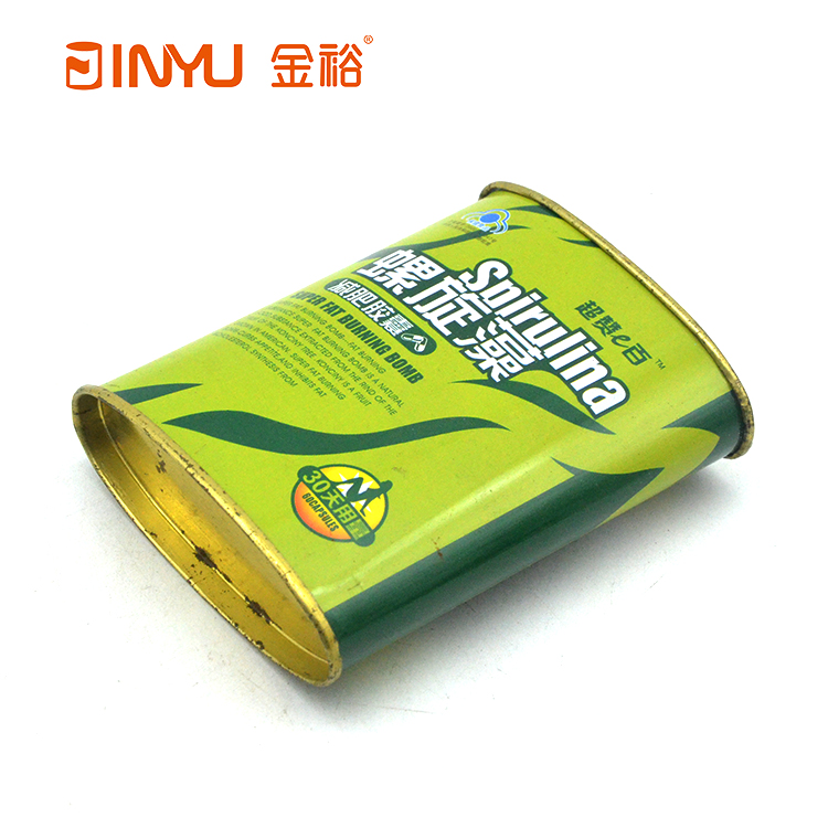 【簡介】此款鐵盒是用來裝螺旋藻減肥膠囊的,橢圓形的造型,封底結(jié)構(gòu),內(nèi)塞蓋的結(jié)構(gòu),小巧精美。