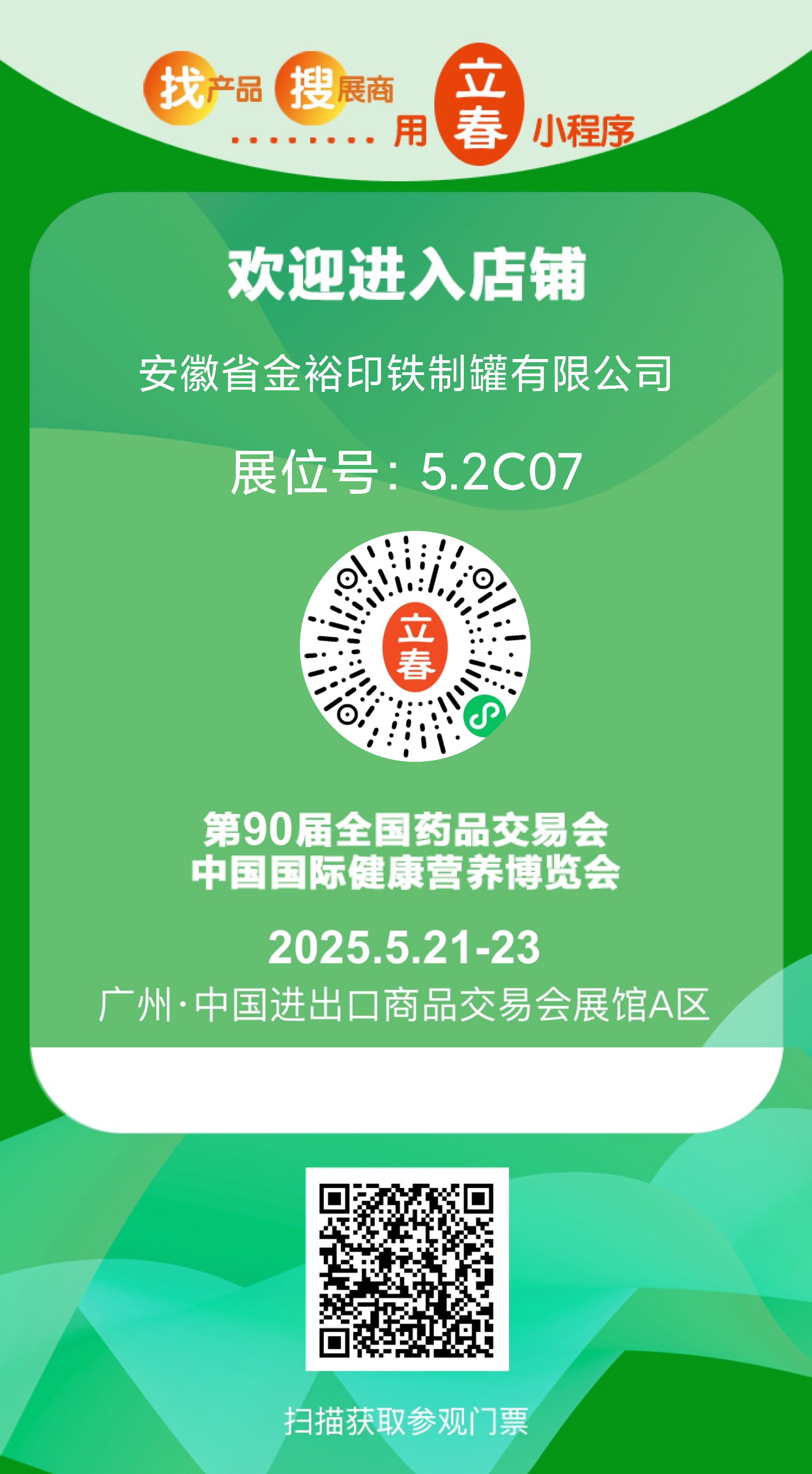 本次展會將于 2025 年 5 月 21 日 - 23 日在廣州中國進出口商品交易會展館 A 區(qū)舉辦,我們的展位號是 5.2C07。在這里,您不僅能與我們面對面交流,還能近距離感受金裕制罐匠心打造的藥品鐵盒包裝產(chǎn)品,期待與您共話合作機遇!現(xiàn)在掃碼即可免費領取參觀門票,輕松開啟這場醫(yī)藥行業(yè)的精彩之旅!