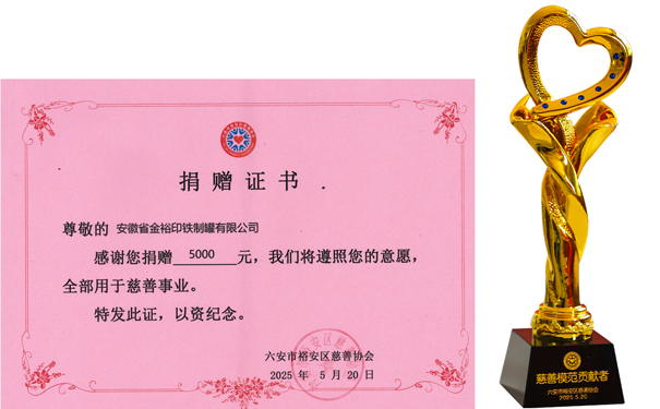 作為從裕安這片熱土上成長起來的本土企業(yè),金裕制罐深知企業(yè)的發(fā)展離不開家鄉(xiāng)人民的支持與社會各界的關(guān)愛。“感恩社會,回饋桑梓”早已融入我們的血脈,成為企業(yè)堅定不移的核心價值理念。多年來,我們始終將慈善公益視為己任,用點滴行動傳遞溫暖: